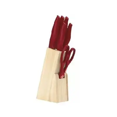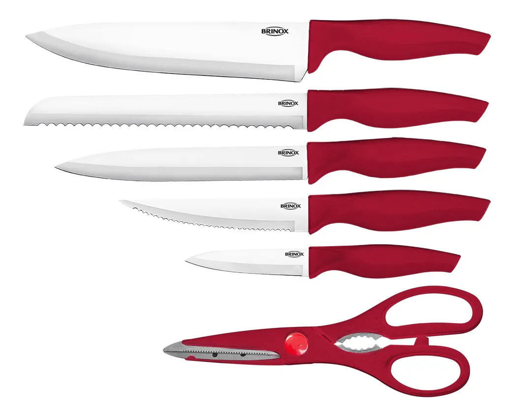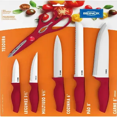 Práctico set de cuchillos Brinox con mango ergonómico en color rojo, ideal para equipar tu cocina con estilo y funcionalidad. Incluye cinco cuchillos de acero inoxidable con diferentes tipos de hoja (lisa y dentada) para cortar carnes, pan, frutas y verduras, además de una tijera multiusos resistente. Su diseño moderno garantiza un agarre cómodo y seguro, facilitando el uso diario en la preparación de alimentos.